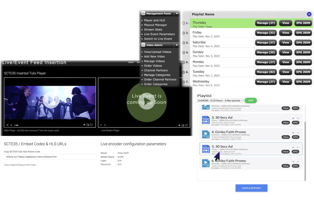 The Cloud Playout platform automatically generates air time and an embed code player for web pages including HLS URL for Mobile application and IPTV devices.